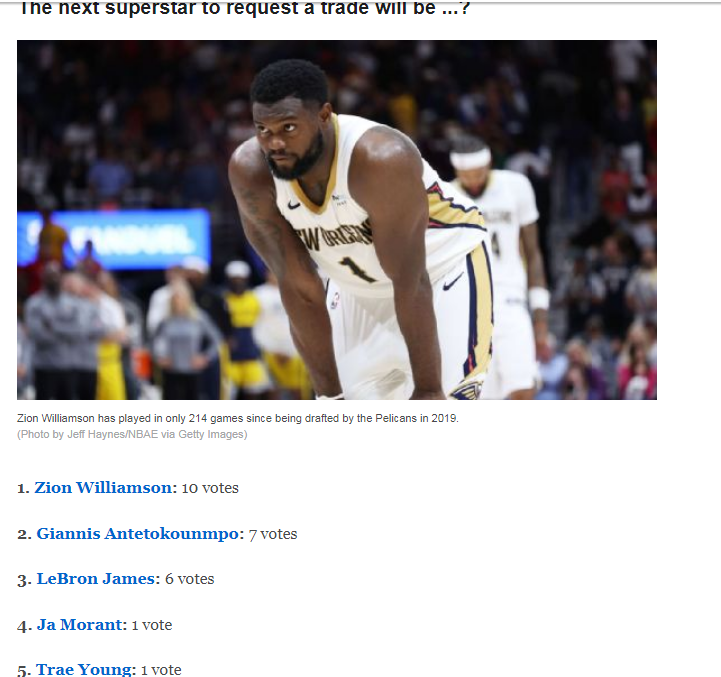 ESPN预测新季可能申请交易球星:锡安居首 字母哥詹姆斯二三